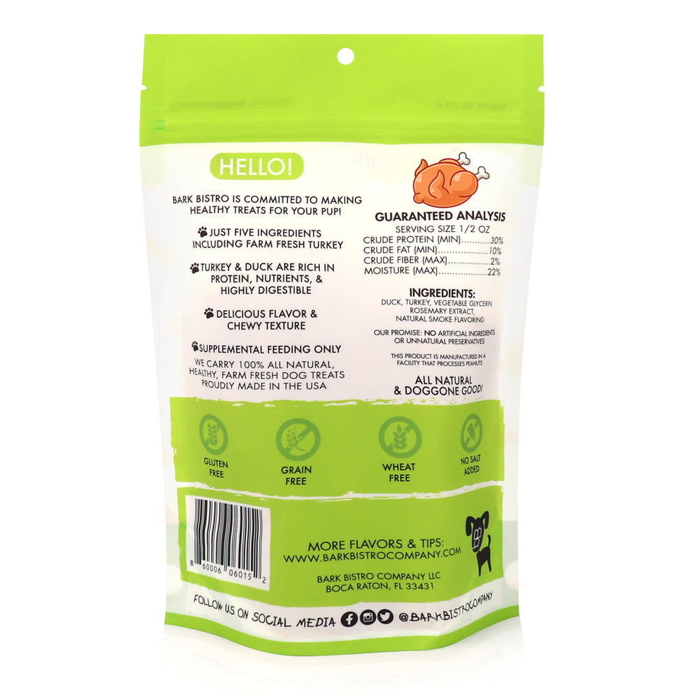 Duck + Turkey + Vegetable Glycerin + Rosemary Extract + Natural Smoke.