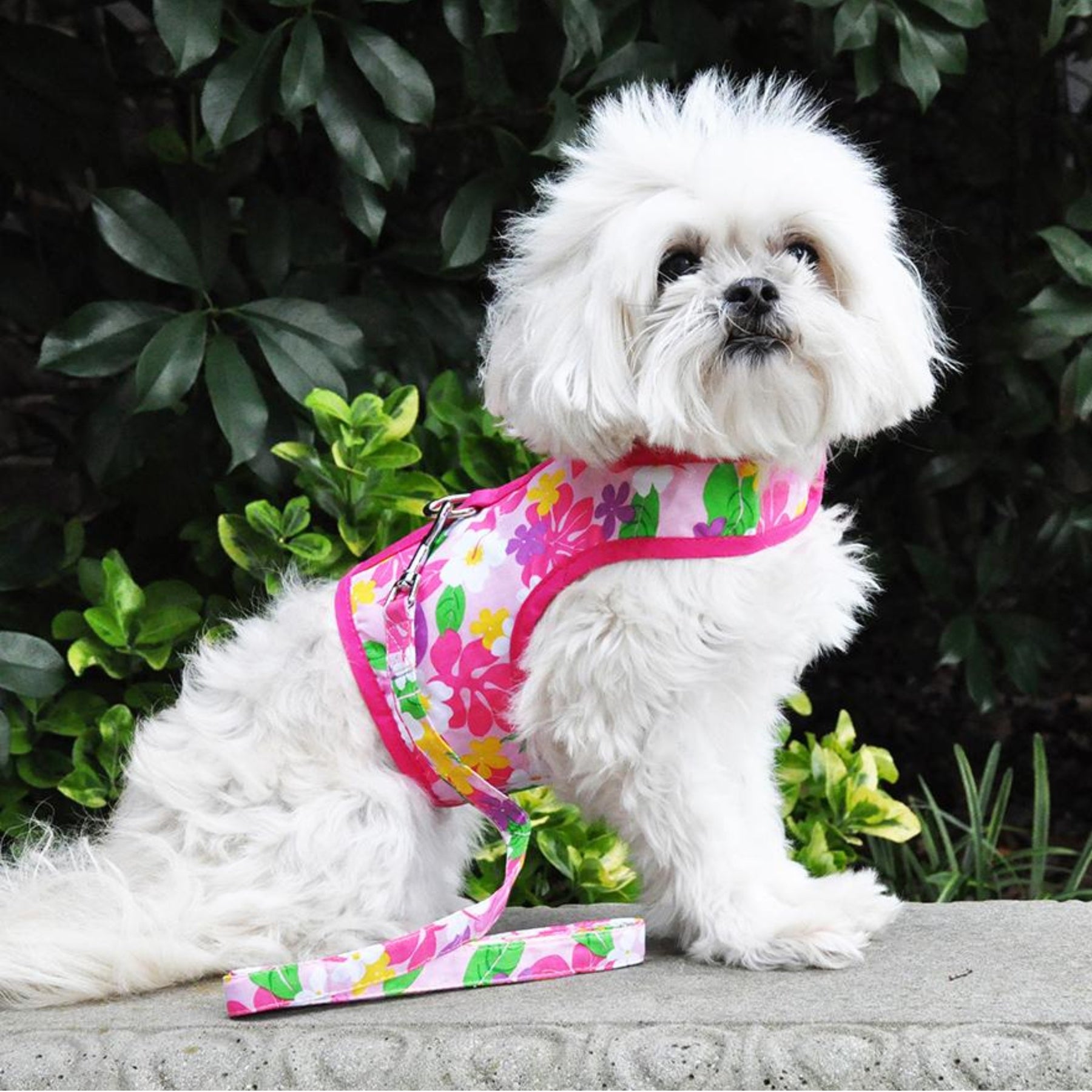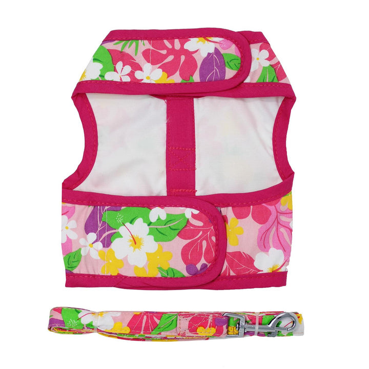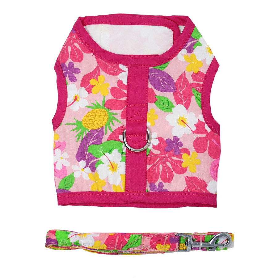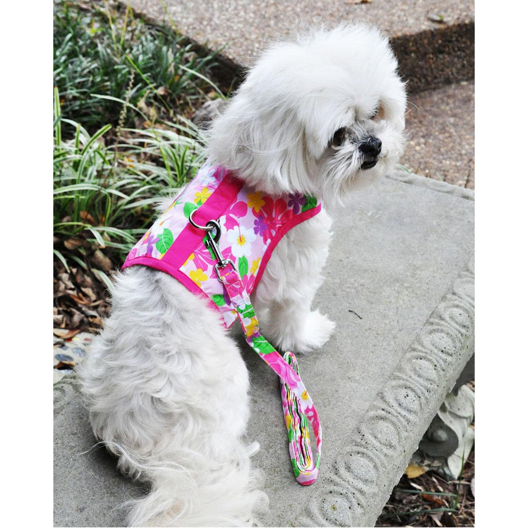 Our tropical Fabric Harness line features our Pink Hawaiian Floral print and a matching leash. Your dog is sure to be noticed during the dog days of summer in this vibrant fabric harness.