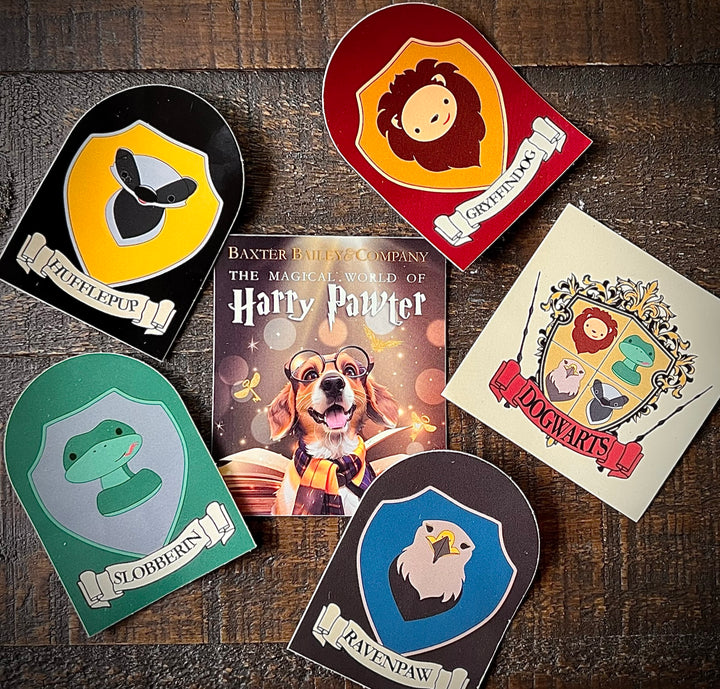 Collect all the stickers with our "I'll Take The Lot" Sticker Collection! In this collection, you will receive one (1) each of: Gryffindog, Slobberin, Ravenpaw, Hufflepup, Dogwarts Crest and Harry Pawter Stickers.