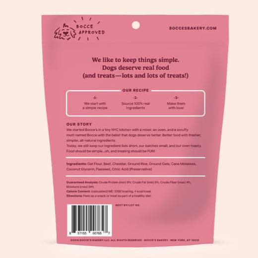 Ingredients: Oat Flour, Beef, Cheddar, Ground Rice, Ground Oats, Molasses, Coconut Glycerin, Flaxseed, Citric Acid