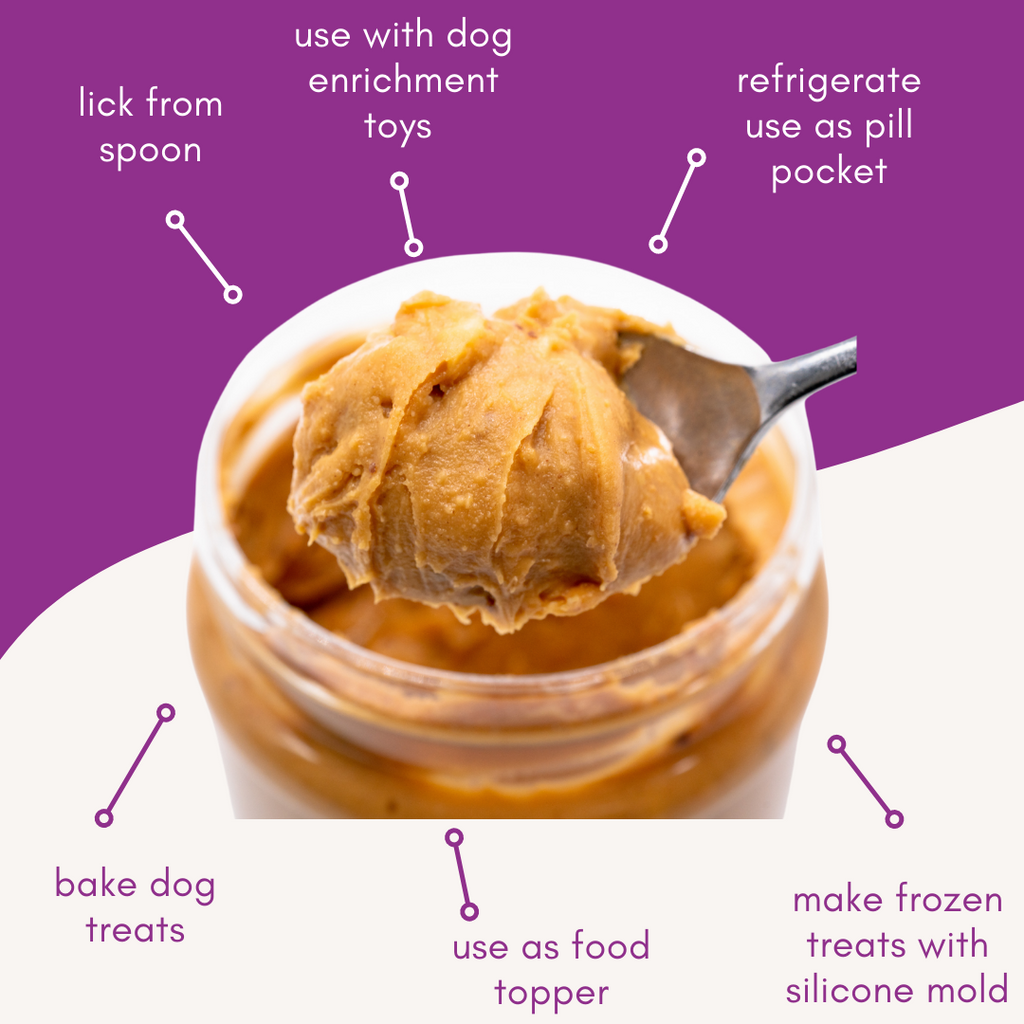 - MULTIFUNCTIONAL -love licking this delicious treat from a spoon or right out the jar, refrigerate for thicker consistency and use as pill pocket, use with dog enrichment toys, spread on lickmat as a distraction during bath time or nail trimmings, make frozen treats with silicone molds, bake homemade dog treats, add on top of sliced bananas or apples. Your options are endless.