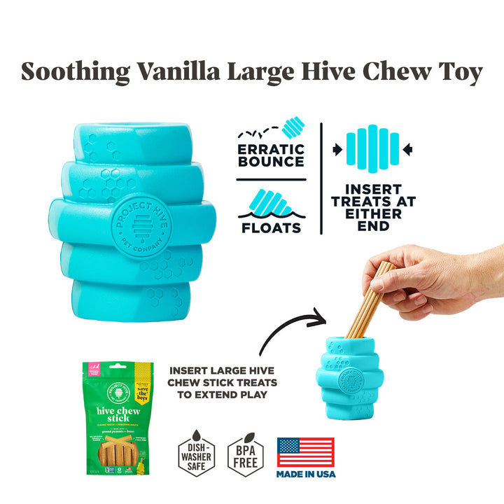Our vanilla-scented Hive Chew Toy is a super engaging toy for larger dogs. Made in the USA, its erratic bounce keeps dogs happily occupied during fetch. Dogs love to gnaw on the Hive Chew Toy’s unique knobby ends, promoting healthy teeth and gums. It's also perfect as a treat dispenser—any treat. We recommend our Hive Chew Stick Treats, uniquely designed to wedge snugly inside the cavity, creating an even more enriching experience for your dog.