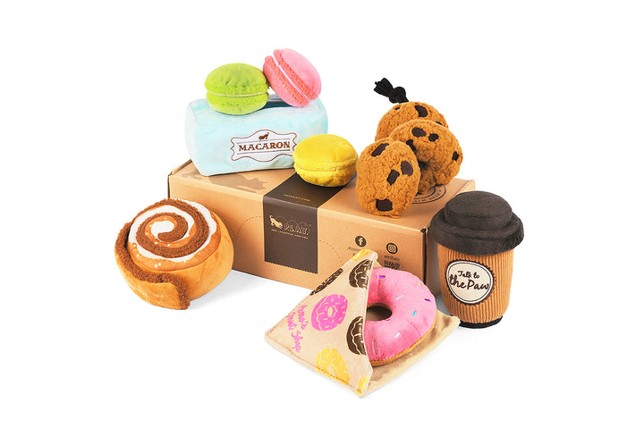 Fuel up for fun with P.L.A.Y.'s Pup Cup Café Plush Toy Collection, a full set of coffee shop themed toys for the energy-filled pup in your life. Share some delectable macarons with furiends