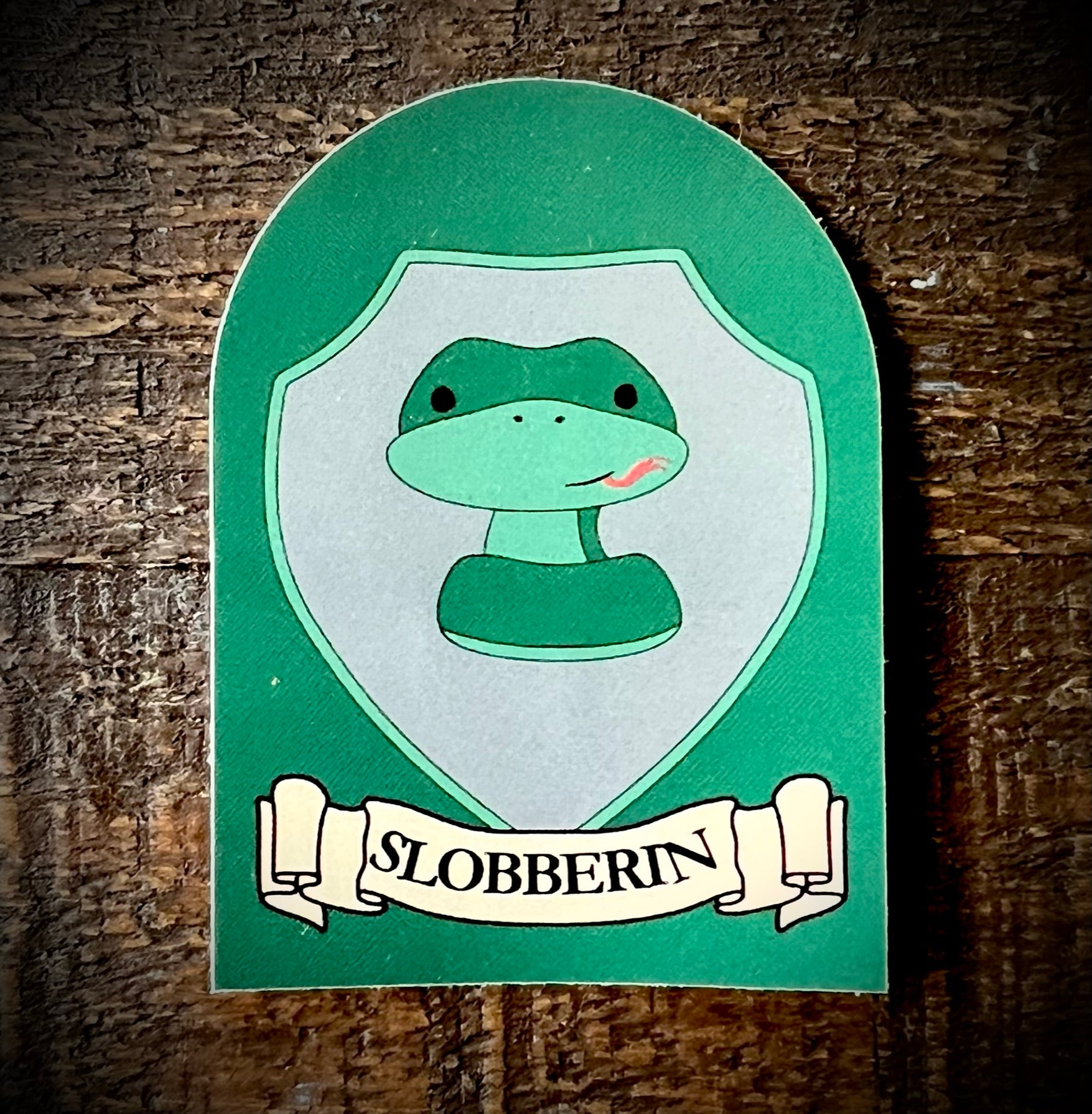 Show your house spirit with this fun crest sticker featuring the Slobberin House Crest!