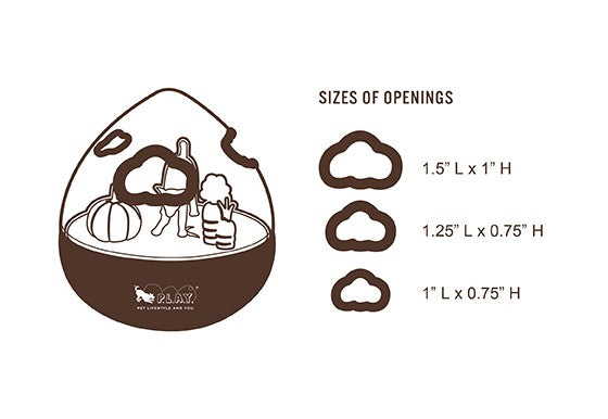 • 3 cloud-shaped openings allow easy insertion and removal of treats or kibble. Sizes of openings range from 1" x 0.63" (smallest) to 1.5" x 0.88" (largest)